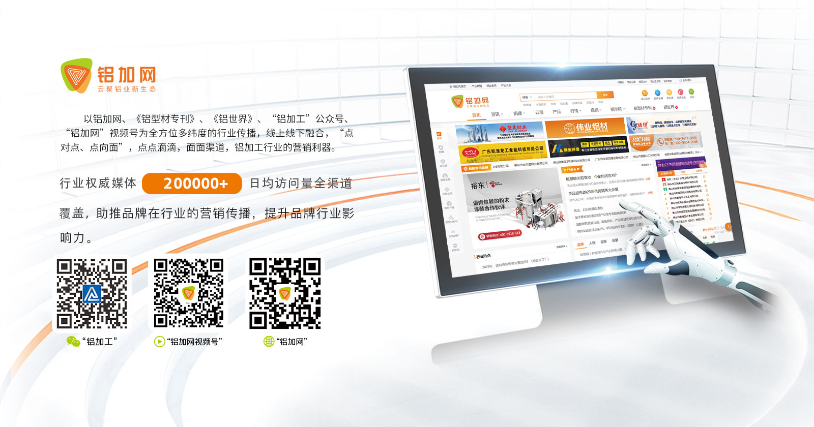 鋁加網(www.albiz.cn)是聞名鋁加工行業的垂直門戶網站,云聚鋁業新生態,構建鋁業新場景,以albiz.cn 網站為核心,以移動云端、鋁加工微信、鋁加網視頻號、《鋁型材專刊》和《鋁世界》雜志為載體,成為了鋁加工行業資訊和精準傳播的首選傳媒。鋁加網,采集和發布全行業信息資訊,提供線上展覽、在線直播、短視頻、品牌策劃、品牌運營、品牌傳播等全方位的專業服務。